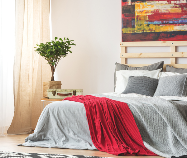 If you’re painting a bedroom with a cozy red quilt on the bed, consider how the warm hue will mingle with your walls. Take into consideration the surrounding colors and lighting, says Matthew S.