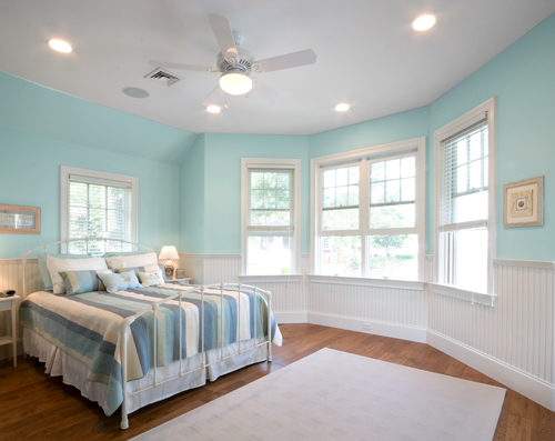 Monet Magic, a soft blue from the ColorEssentials Collection, adds a splash of cool color above this bedroom’s wainscoting. Monet Magic has an LRV of 66, so it reflects much of the room’s natural and artificial light. Colors with an LRV above 50 are lighter and bounce back more light than they absorb. Higher LRVs help create an illuminated “daytime” feel.