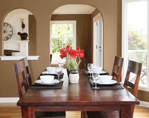 The walls of this open dining room gain welcoming warmth with Weaver's Tool, a warm brown from the ColorEssentials Collection.  Weaver's Tool has an LRV of 25—much lower than Monet Magic. Any LRV less than 50 will be on the darker side, soaking up more light than it reflects. Additional lighting, such as the fixture above the table, is necessary to add more light to the room because the walls absorb much of it. The color’s low LRV creates an intimate dining space while a color with a higher LRV might make the room seem more expansive.